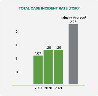 2 Graphs depict S&C's TCIR and DART performance from 2021 in comparison to industry averages for TCIR and DART. These industry averages were sourced from 2020 U.S. Department of Labor NAICS statistics.